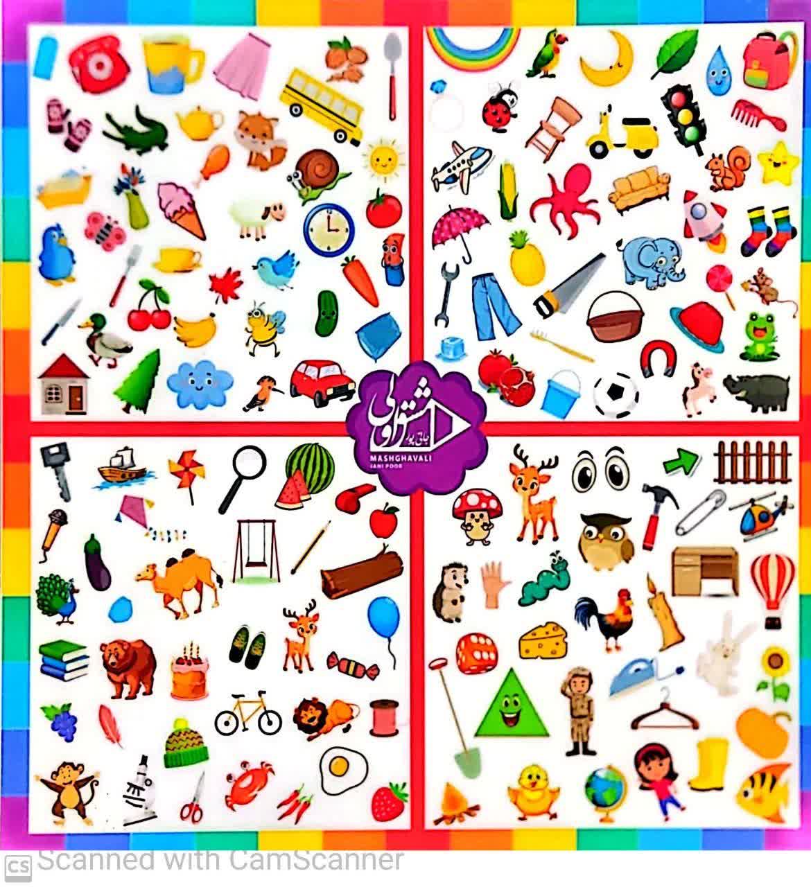 یک صفحه دورو شامل انواع تصاویر برای صوت آموزی در نگاره ها و بعدا برای املا تصویری