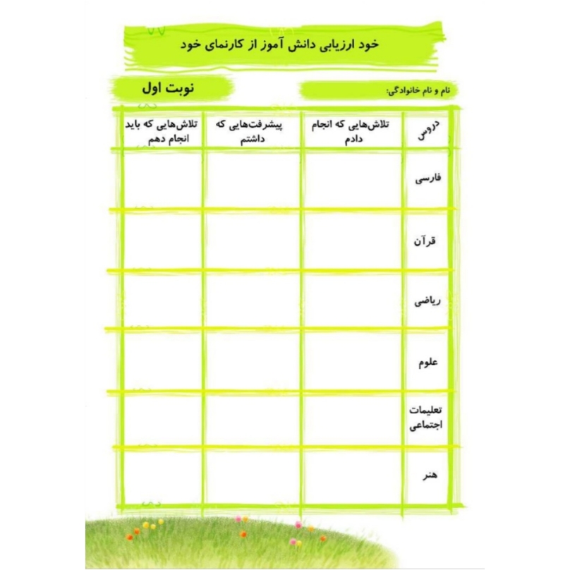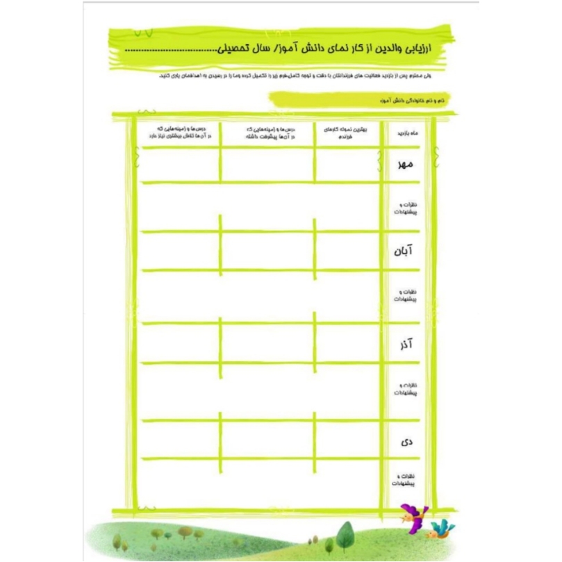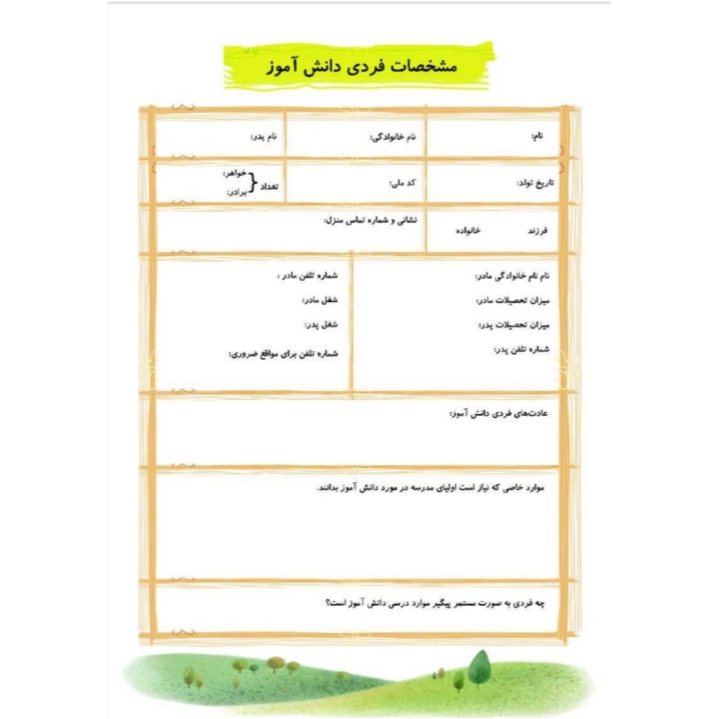 با طراحی جذاب همراه با تمام کاربرگ های مورد نیاز از فرم مشخصات گرفته تا جدا کننده های هر درس و، فرم ارزیابی والدین، فرم ارزیابی مدیر ، فرم خودسنجی ، چک لیست تمام دروس