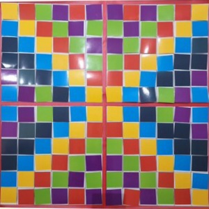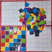 صفحه ی آموزشی تقارن از جنس بنر در ابعاد 70 در 70 همراه با 144 قطعه کارت مقوای سلفون کش رنگی مناسب جهت تمرین تقارن و الگوی شطرنجی